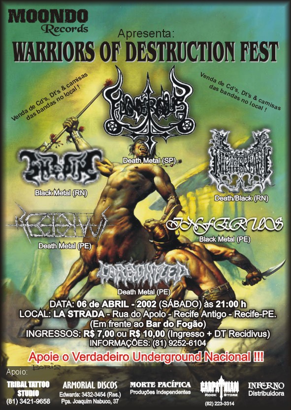 Chega o sábado (06/04), a expectativa muito grande, seria nosso primeiro show em casa. Chegamos cedo ao local do evento (La Strada), no bairro do Recife Antigo, reduto da boêmia e da porra-louquice da cidade. Esse foi o Warriors Of Destruction Fest, contando com: Recidivus (PE), Inferus (PE), Carbonized (PE), Funeratus (SP), Shedim (RN), Nightbreath (RN). O festival, organizado pela Moondo Records (e com apoio de grandes irmãos locais), teve a presença maciça de mais de 400 bangers se espremendo e batendo cabeça em todas as atrações. Puro espírito underground, muito metal e bebida para todo lado, missão cumprida!!!