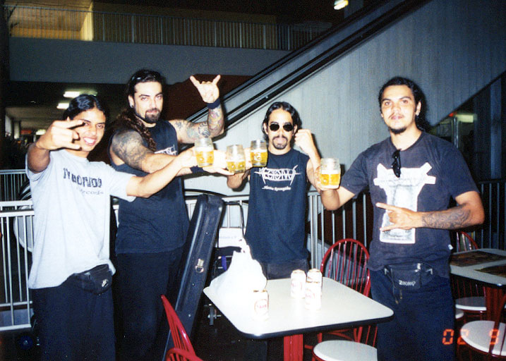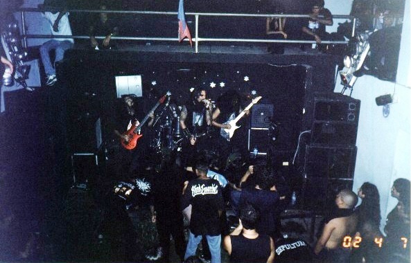 Próximos ao fim do percurso, demos uma paradinha rápida em Londrina, na casa dos brothers do Subtera, onde recarregamos as energias e seguimos mais uma hora até Maringá. Enfim, conseguimos chegar a tempo no local, o tradicional Tribo´s Bar, onde o amigo e produtor Gilson (Holder) nos recebeu. Tocaram nessa noite: Recidivus (PE), Imperial Devastation (SP), Holder (PR). Foi uma boa recepção, revemos amigos e amigas, inclusive nossos irmãos Alison, Celso e Elias (ambos do Sortilégio Zine), que vieram de Primavera/SP para esse show. A surpresa veio quando estávamos tocando, e no meio da apresentação nós observamos um dos motoristas da Van em meio ao público gritando: Dá-lhe Pernambuco!!! Imaginem, o cara estava com uma garrafa de licor de menta, batendo cabeça, e [chapado]. Um tremendo porra-lôca!!! Os dois motoristas da Van eram os mais loucos do local, chaparam de tudo… Então tivemos que dar um grande tempo após o show, para que os dois irresponsáveis dormissem um pouco e conseguíssemos chegar a tempo e vivos para o show de Tremembé/SP. Nesse intervalo, seguimos para casa de uma amiga e logo após fomos à feira da cidade comer uns pastéis, tudo em companhia do Gilson e dos brothers do Imperial Devastation e Sortilégio Zine.
