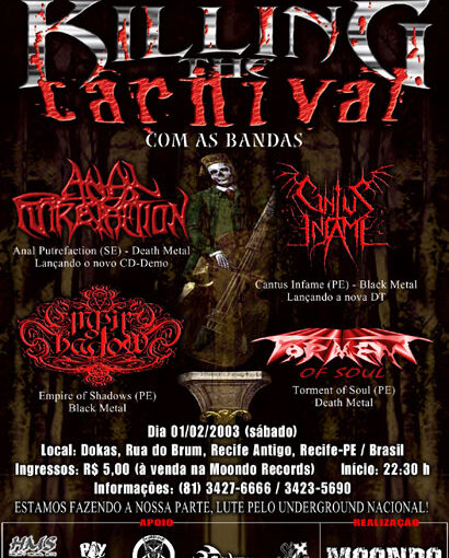Seguimos em Van com os amigos e guerreiros do Anthropophagical Warfare, e chegamos até a capital Cearense um dia antes do evento. Tivemos grande recepção por parte da produção e curtimos uma sexta-feira regada a muito bate-papo e álcool, claro!!! No dia seguinte, fomos passar o som e conhecer o local do show, o qual tinha excelente estrutura… Enfim é chegada a hora, um bom público compareceu ao evento, em torno de 300 pessoas, todas loucas curtindo o Metal Extremo. Conseguimos adiantar um bom merchandise e trocamos muitas idéias com os bangers presentes. Vale salientar também, as grandes apresentações do Revel Decay (killer) e Anthropophagical Warfare (old brutal).